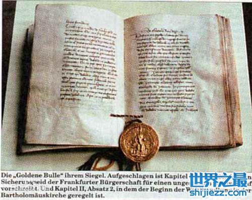 1356年卡尔四世金玺诏书,这应该是最有名的金玺诏书。西元1356年由神圣罗马帝国皇帝卡尔四世于纽伦堡发布,确立了日后神圣罗马帝国的皇帝以选举产生,帝国境内有七位选帝侯享有此重要权力,分别是美因兹大主教、科隆大主教、特里尔大主教等三位教会选侯;波希米亚国王、莱茵普法尔茨伯爵、萨克森维腾堡公爵、勃兰登堡藩侯等四位世俗选侯。