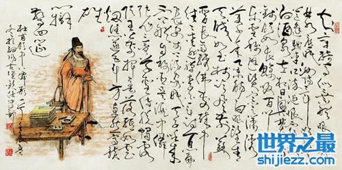 张旭饮酒三杯,即挥毫作书,时人称为草圣。他常不拘小节,在王公贵戚面前脱帽露顶,挥笔疾书,若得神助,其书如云烟之泻于纸张。