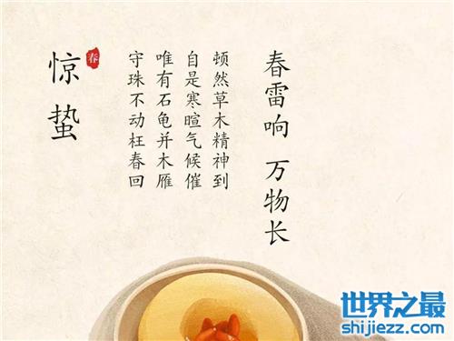 惊蛰的意思是天气回暖,春雷始鸣,惊醒蛰伏于地下越冬的蛇虫鼠蚁。蛰是藏的意思。实际上,昆虫是听不到雷声的,大地回春,大自然节律才是使各种蛰虫有感,因此开始活动的原因。惊蛰时节,春雷乍动、雨水增多、气温回升,万物生机盎然,是万物生长的好时光,该种的农作物都可以开始种了。惊蛰是耕种的好时节,中国各地随着气温回升,日照增加,由南向北渐次进入春耕时节。