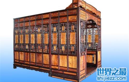 楠木垂花柱式拔步床,明·中期(右图此床通高2460,长2390,宽2320mm,体形庞大。拔步床也称“八步床”示其巨大。挂檐及横眉部分均镂刻透雕,表现古代人物故事;前门围栏及周围档板刻有麒麟、凤凰、牡丹、卷叶等纹样,刀法圆熟,工艺高超,体现出明代中期的典型风格。