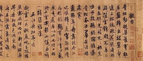 从总体看,《蜀素帖》整体的精神团聚和局部的欹正错落交互补衬,浓淡枯润、疏密虚实,此起彼伏,形成了完美的“振迅天真,出于意外”之态。在章法上,紧凑的点画与大段的空白强烈对比,粗重的笔画与轻柔的线条交互出现,流利的笔势与涩滞的笔触相生相济,风樯阵马的动态与沉稳雍容的静意完美结合,形成了《蜀素帖》独具一格的章法特色。