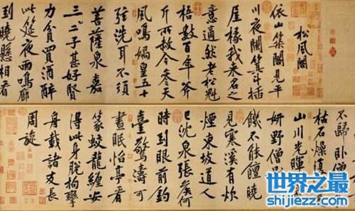 《松风阁诗帖》是黄庭坚七言诗作并行书,墨迹纸本,纵32.8厘米横219.2厘米,全文计29行,153字。台北故宫博物院藏。