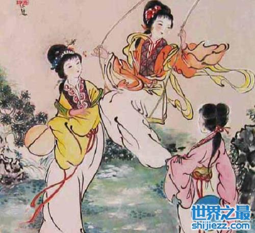 秋千为古代女子所钟爱。汉时,北方游牧民族喜欢学习轻捷矫健的姿态,每当寒食节就戏秋千。后来,中原女子学之,是用彩色绳子悬在树上立架。
