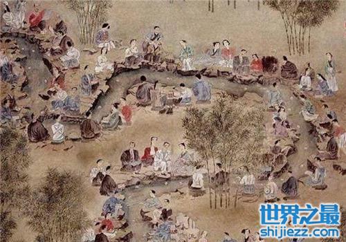 “曲水流觞”这项活动在后期是一些文人们的活动。其实就是在院子里挖一条小河,然后让仆人在河的上游将酒杯漂浮在河面上,当酒杯漂到哪位的面前时,那位就要去作一首诗。如果作不出的话就要去喝酒。