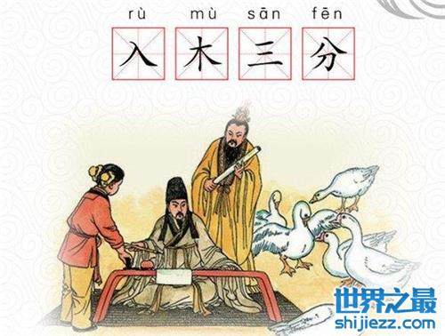 东晋明帝有一次要到京都建康北郊覆舟山祭祀土地神,让王羲之把祭文写在木制祝板上,再派人雕刻。刻者把木头剔去一层又一层,发现王羲之的墨迹竟渗进木板深处,直到剔去三分厚才见白底!刻者惊叹其笔力雄劲:“竟入木三分!”后“入木三分”成为成语,比喻书法功力好或分析问题透彻。