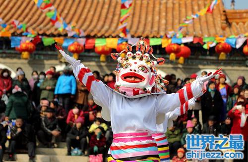 三是广场查玛:在大雄宝殿前广场上表演。人物众多,程式固定。