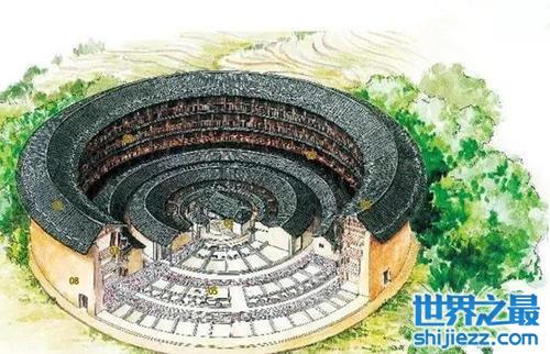 圆楼亦相同,大门、中心大厅、后厅都置于中轴线上。