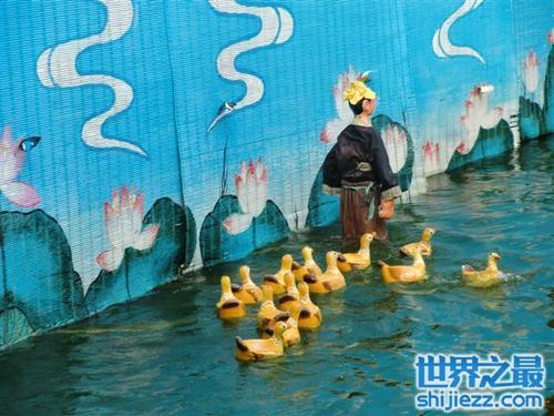 不惟如此,在其后的“牛耕”、“斗牛”、“插秧”、“戽水”之“农耕图”中,在“乘船垂钓”、“钓水鸡”、“罟鱼”及鱼、鸡、蛇嬉水场面中,还是戏房两旁的小戏台中的画面“碓米”、“磨面”、“掏米、“打秋千”的生活画图等节目中,其表现手法都力求“精巧”,使观众跟随水傀儡游览于恬静优雅的大自然的田园风光之中,去领略清新的农耕生活气息,给人带来艺术美的愉悦。