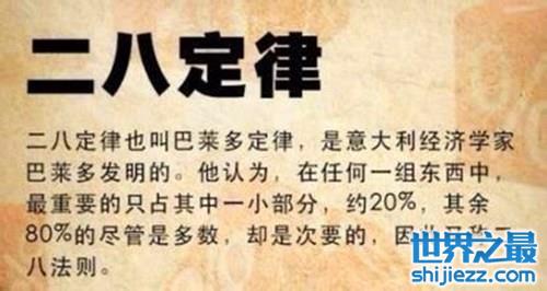 二八定律又名80/20定律、帕累托法则(Pareto‘s principle)也叫巴莱特定律、朱伦法则(Juran's Principle)、关键少数法则(Vital Few Rule)、不重要多数法则(Trivial Many Rule)、最省力的法则、不平衡原则等,被广泛应用于社会学及企业管理学等。