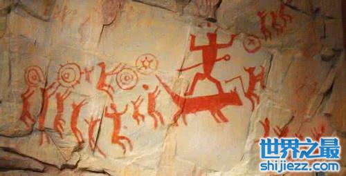 战争的画面在人群之中有持弩而射的,又有倒地而死的。有一幅村落图,描写战争凯旋返回村落的情景,大约是一次重大战争的记录。岩画年代,经放射性碳素断代测定为距今约3000年,同时在岩画分布区内发现新石器时代遗址多处,这些事实大体上可以证明岩画当为新石器时代的遗物。