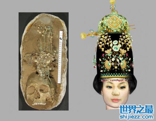 解开三层尸布后真空露出:是一位穿戴华丽,黑发细眉,肤色如常的女尸,保存十分完好。从考古发现来看,此为明代宁王王妃墓。女尸是明太祖朱元璋的孙媳妇,即靖王朱奠培第四夫人吴氏的遗体。教授赵成文运用高科技手段,成功将一明代王妃的头像进行复原,从复原图可以看出,明王妃是最典型的具有的鸭蛋形脸庞的东方美女。