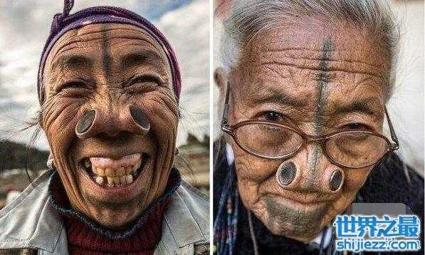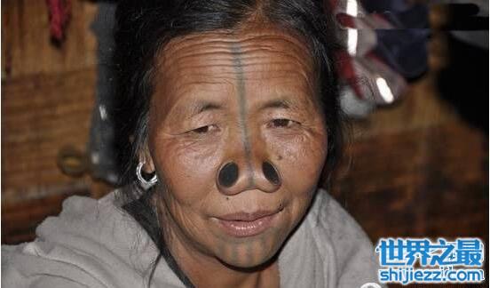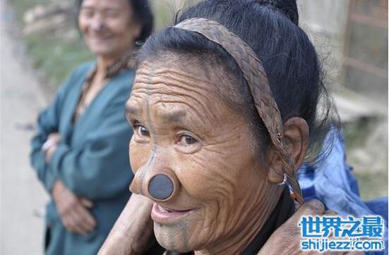 在印度阿鲁纳恰尔邦有一个村落,里面住着的阿帕塔尼人,有一个非常残忍的习俗,女子成年后必须要在鼻子上挖两个洞,然后把木质木塞塞进去,看起来奇丑无比,但是据说她们这样是为了保护自己。这样奇葩的习俗还真不只是阿帕塔尼人,其他部落也有。