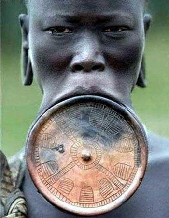 非洲依索比亚南部就有一个原始部落叫Mursi族,族里的女人从小就会用拿泥做的盘子来把自己的下嘴唇撑大,唇内的盘子越大越美。这审美观也真是拍案叫绝了····