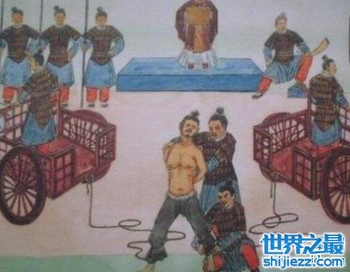 即五马分尸,很简单,就是把受刑人的头跟四肢套上绳子,由五匹快马拉着向五个方向急奔,把人撕成六块。记得商鞅就是受五马分尸之刑。商鞅后代也受到了连累,要把人的头跟四肢砍下来都得花不少力气,更何况是用拉扯的。而受刑人身受的苦处更可想而知。真到撕开的时候,恐怕受刑人已经不会觉得痛苦了。痛苦的是正在拉扯的时候。