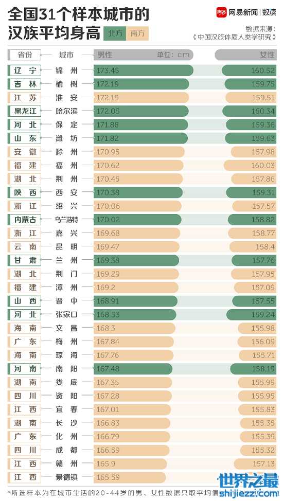 我们可以看到,虽然排在排行榜前列的大多都是北方城市,但是和一些南方城市的平均身高其实差异并不是很大。并没有我们平时认为的,北方人比南方人高出一截的感觉。江西景德镇以男性165.59cm、女性155.06cm的数值排在榜单的最后。