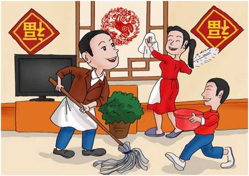 “腊月二十三,掸尘扫房子”,其用意是要把一切穷运、晦气统统扫出门。这一习俗寄托着人们破旧立新的愿望和辞旧迎新的祈求。每逢春节来临,家家户户都要打扫环境,清洗各种器具,拆洗被褥窗帘,洒扫六闾庭院,掸拂尘垢蛛网,疏浚明渠暗沟,到处洋溢着欢欢喜喜搞卫生、干干净净迎新春的欢乐气氛。