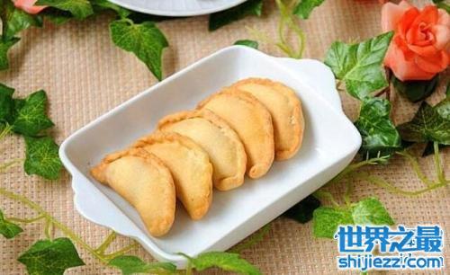 这道菜有另一个名字叫角仔。他是广东地区一个非常传统的食品。因为每个地区制作它的材料不同,所以它的口味也不是特别的相同。有甜口的,也有咸口的。它的主要材料是面粉,鸡蛋和猪油,包成饺子形状,炸成金黄,象征着新的一年非常的富足。也寓意着一家平安。