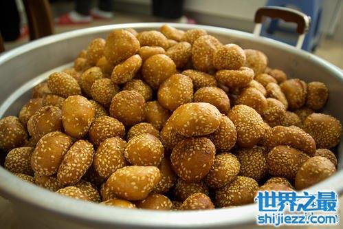 这道菜也是一个非常常见的小吃,一般也是在逢年过节的时候制作,象征着一家人团团圆圆的,它的主要材料是糯米,然后也会放一些豆沙馅儿。将糯米粉和糖水搅拌成面团,包上豆沙馅,最后把他们团成面团,放到锅中炸至金黄,就可以吃了。