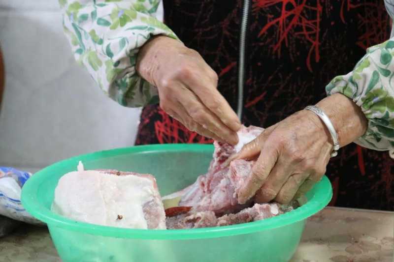 而在一旁的许火珍阿姨,也忙活着开始腌制咸肉,将准备好的五花肉少量多次抹上细盐并反复揉搓,直到均匀入味,再加入老姜、辣椒、香叶、桂皮、白酒等调料,这些调味料既可以杀菌也能提升肉的香味。在腌制入味之后,还需晾晒风干,直至结晶,“咸肉就是要在冬天腌制,天冷了适合晾晒风干,这时节腌制的咸肉,炖白菜、炖土豆,都是很好吃的。”许火珍说道。