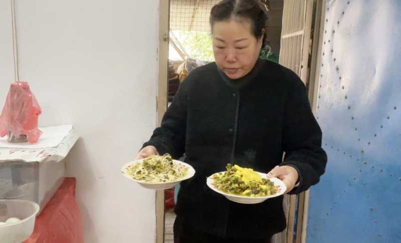 腌制好的咸菜将由青变黄,周阿姨拿出自己新鲜腌制的咸菜,炒制了几个家常菜招呼邻居。“像这个咸菜炒干丝、炒鸡肉、炒毛豆,加了咸菜之后,就会更鲜,更好吃”。