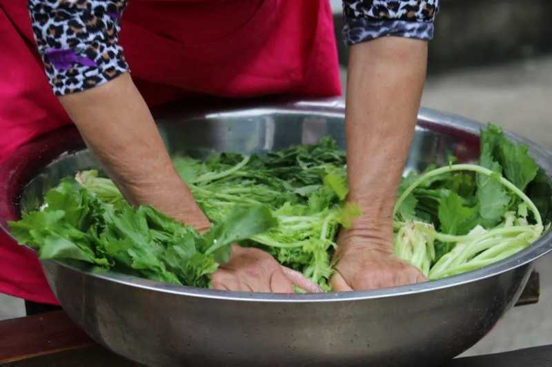 一早,家住金山区朱泾镇秀州村的周爱萍阿姨和邻居们就开始忙活起来了,周阿姨在自己门前的田里采摘了一些绿叶菜,开始准备腌菜,先将雪菜洗净晾干,加入盐和辣椒之后,使劲揉搓。周阿姨告诉记者,这些雪菜腌制一夜之后,要装瓶储存近一个月之后,才能食用。“现在这个季节,田里来的大头菜、雪菜、青菜,都可以腌制”。周阿姨一边揉着菜,一边说,“像小雪前后,我们都开始腌菜了,今年我腌的第一批菜,都差不多可以吃了”。
