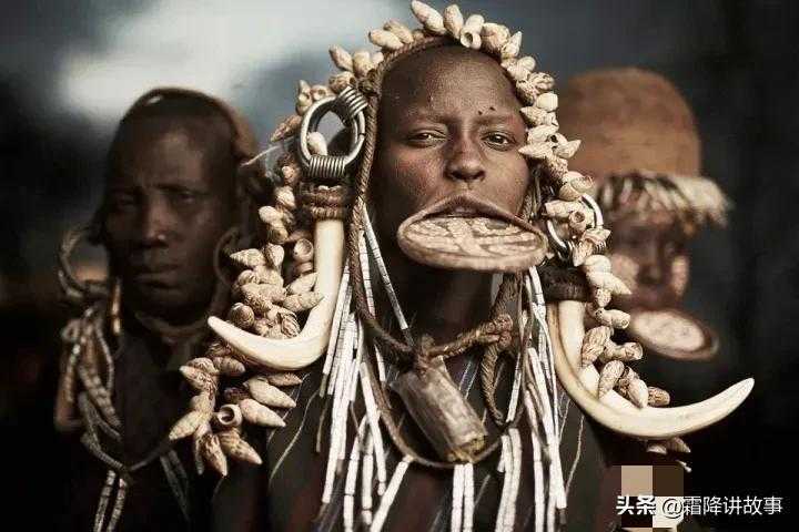 他们是埃塞俄比亚最神秘最古老的部落。摩尔西族。和长颈族相似,长颈族在脖子上下工夫他们在嘴上下工夫。部落里的女孩会在十岁的时候往下唇切开一个口子,再在里面装上陶土盘子,耳垂也是如此。等她们长大,就换上更大的盘子。越是年长,嘴上的盘子也就越大,最大的唇盘可以到达25厘米。唇盘越大,她们以后嫁人就可以拿到更高的彩礼。为了适应唇盘的存在,有的女人们还要拔掉几个牙齿。
