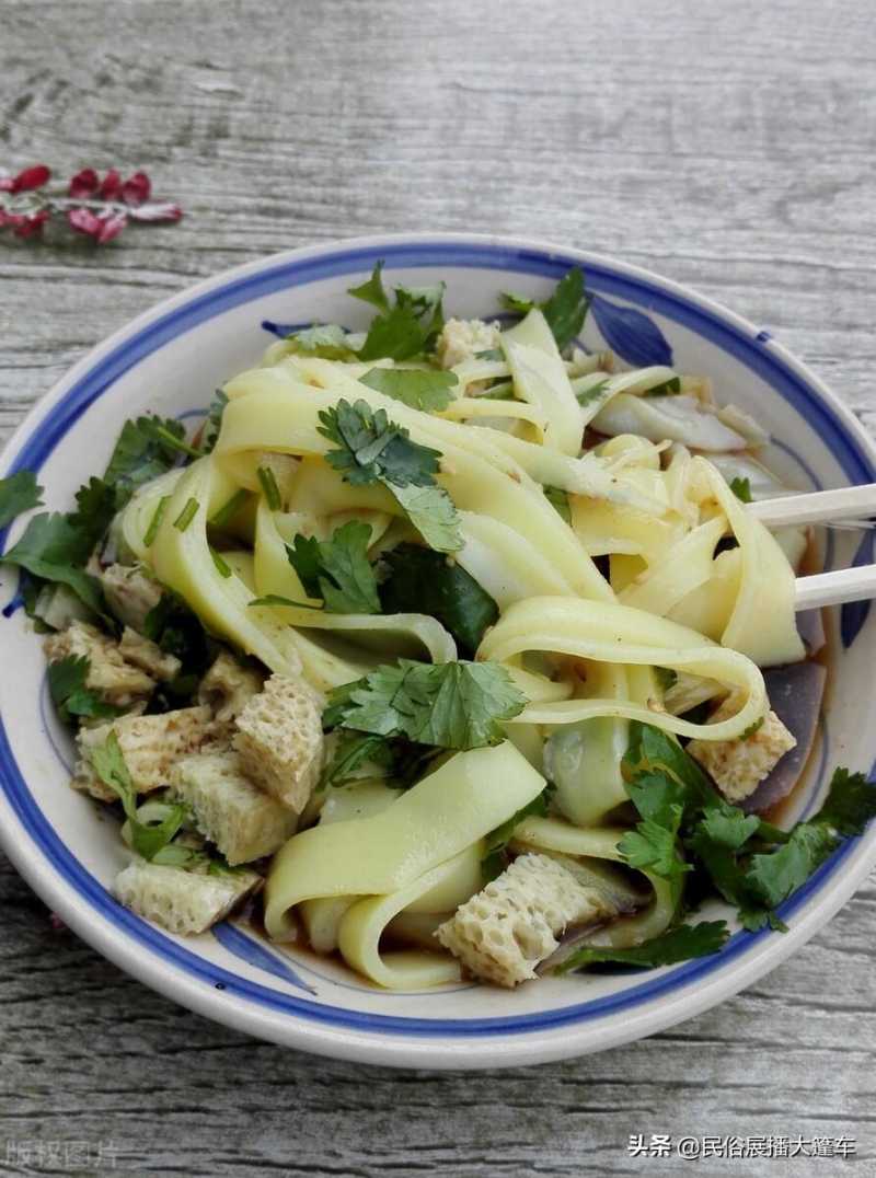 刀拨面也是山西一道面食,制作此面也有一定技术难度。首先得会擀面,把擀好的面皮码4-5层,然后用专用刀在案板上拔,要掌握好抜面节奏和速度,越快越能保证面条宽窄一致,让人感觉拔面的人好像在参加比赛似的争分夺秒,其实,只有保证速度才能保证面条质量。