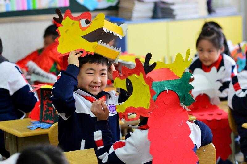2月20日,山东省青岛市市北区广饶路小学,学生戴着手工制作的龙头做游戏。王海滨 摄