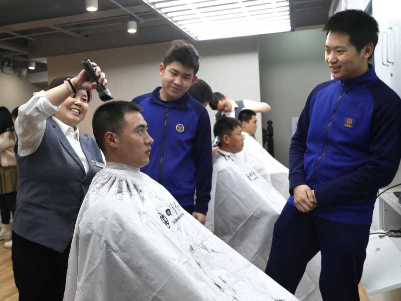 2月21日,北京四联美发前门店开设了公益服务专场,为消防指战员义务理发。中国日报记者 邹红 摄