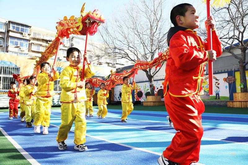 2月20日,河北省唐山市丰润区一家幼儿园,小朋友们表演舞龙。朱大勇 摄