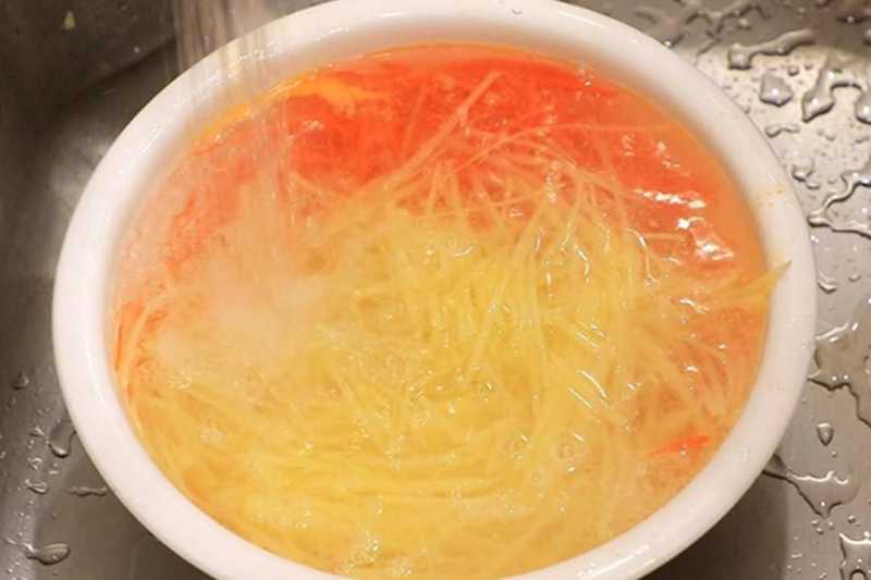 1.土豆、胡萝卜各一个,去皮后切成细丝,用清水淘洗干净,然后开水下锅汆煮30秒钟捞出,用清水冲洗过凉,提前把配菜煮断生,方便一会煎熟。