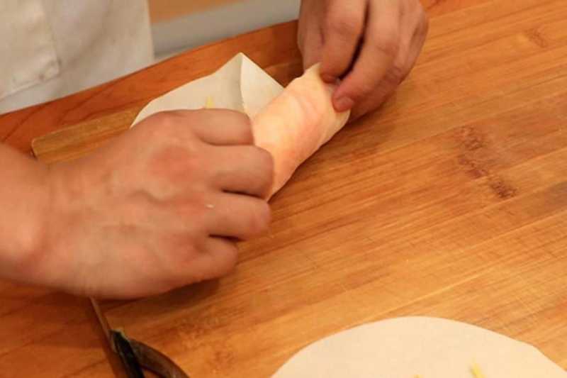 3.准备几张春卷皮,把菜丝包裹在里面,然后卷起来做成春卷。