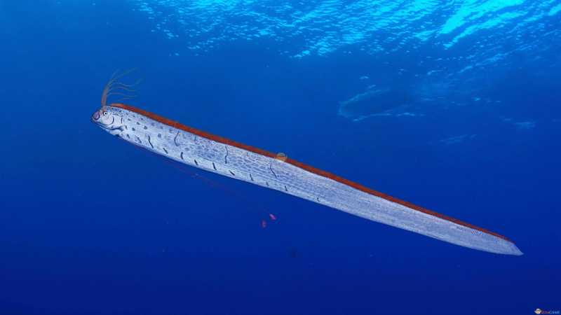 巨型皇带鱼是世界上最长的硬骨鱼,身形为带状,侧面比较窄。背鳍、胸鳍短而粗,腹鳍呈现长桨状。