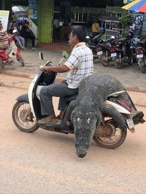 东南亚的街头就是这么狂野,一个男人骑摩托车,载着一条大鳄鱼招摇过市。