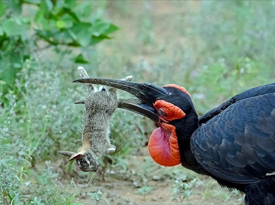 地犀鸟真是一种攻击力爆棚的可怕鸟类,一口就能吞下一只兔子!