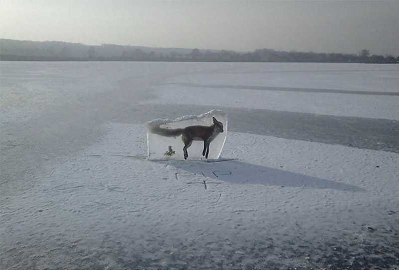 一只狐狸不小心掉进了冰湖,被冻成了冰雕。