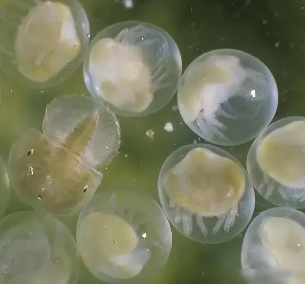 它就是一种类似休眠状态的状态,我们现在看到的鲎卵是非常柔软的,但是鲎虫卵是逐渐变得非常硬,然而正是这硬的让人不能透气的壳子,让它可以存活下来,也可以让它变得非常轻便,可以和水上的泡沫一样飘在水里不会沉下去,可以吸到光合作用的光。