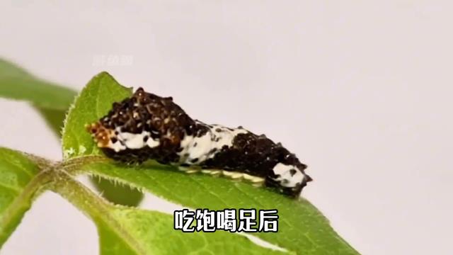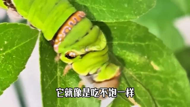 此时毛毛虫吃树叶的动作越来越明显,而且进食的速度相当惊人,它就像是吃不饱一样为后续的蜕变疯狂进食。几小时后树叶被它啃的所剩无几,地下的粪便更是多的超乎想象。
