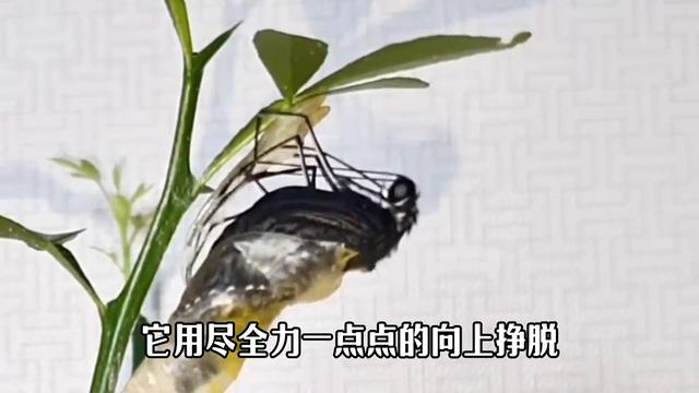 一晚上的时间蛹就安顿了下来,慢慢的蛹从嫩绿色变成了黑色,而且随着时间的推移开始摇晃身体,它似乎正在与蛹壳分离。随着尾巴部位分离成功,蝴蝶终于破壳而出,它用尽全力一点点的向上挣脱。在此期间,它们会一次性排出蛹期积累的所有废物。慢慢的它的爪子抓住树叶,一下子就与蛹分离成功,一只美丽的蝴蝶呈现眼前。