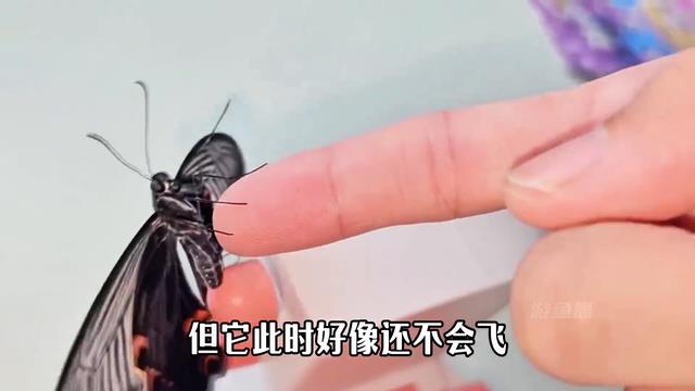 接下来就到了晾干翅膀的阶段,一小时后蝴蝶完成了所有的蜕变。我小心翼翼的伸出手指,没想到它居然爬了上来。它看起来酷极了,黑色的皮肤下泛着蓝色的光芒,下方的斑点像是孔雀身上的花纹,在黑色的衬托下格外耀眼。但它此时好像还不会飞,它尽可能的抓住一切东西来保持平衡。