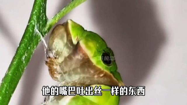 第二天我拿了个小绿植,打算把毛毛虫放进去玩耍,结果没想到仅仅两天的时间叶子都被它吃光,而它却爬上了另一个根茎上休息。但是此时它好像不太正常,它的嘴巴吐出丝一样的东西,而且身体的颜色开始变化。在它不断的雇佣下,一只神奇的蛹破壳而出。