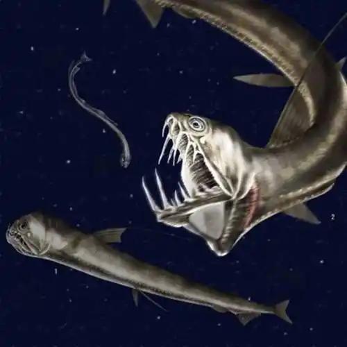 大小12一24英寸,栖息深度250一5000英尺,分布在全球热带温带海域,它的牙像毒蛇的牙齿,长而伸出,毒蛇鱼极具掠夺性,它利用身上发光器引诱猎物而捕食,能吞下和自身同大的猎物。