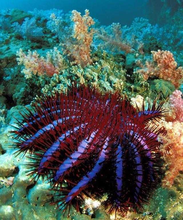 又称“魔鬼海星”,体长25一30厘米,最长达70厘米,是一种生活在热带珊瑚礁海城的大型海星,体内含有毒素,被刺后引起剧烈疼痛,严重时导致呼吸麻痹,因以珊瑚为食,破坏力极强而被称为“珊瑚杀手”。