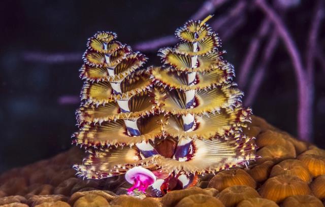 体长5一8厘米,寿命可达20一30年,分布在全球热带珊瑚礁海域,是一种小型管栖环节动物,因其头部两簇色彩鲜艳,呈螺旋状排列的鳃冠状似“圣诞树”而得名,被誉为“海洋中的含羞草”。