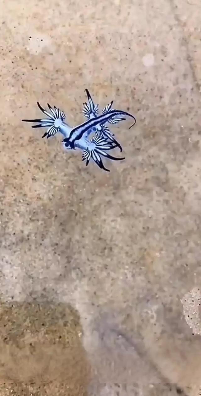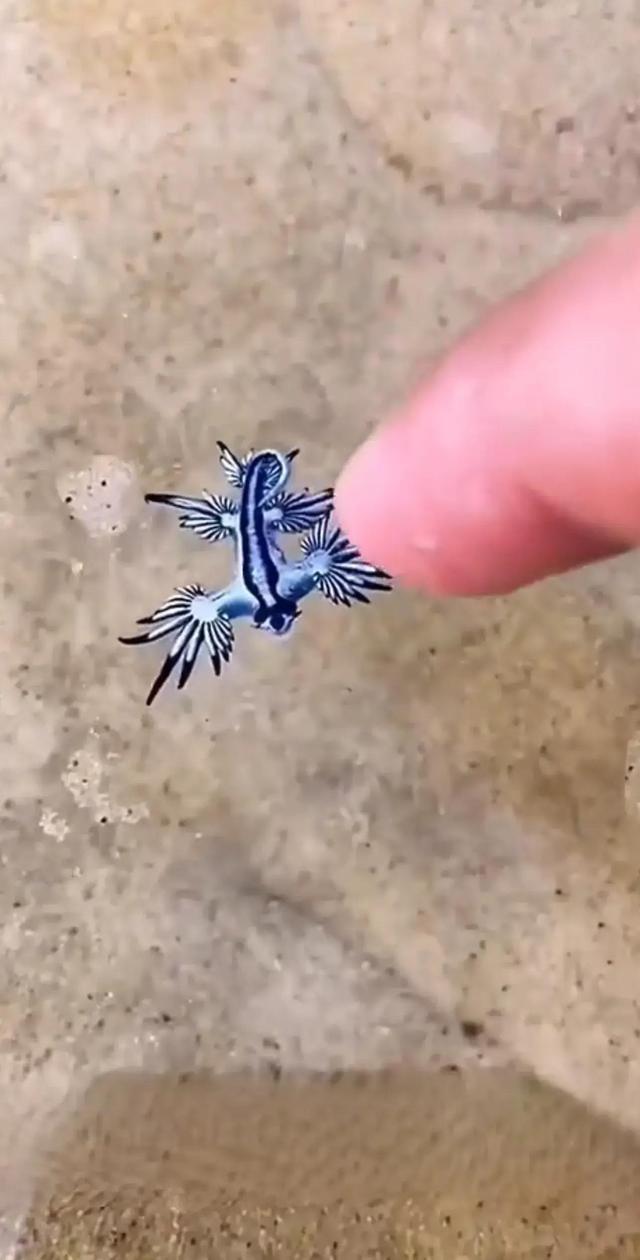 这事很快上了同城热榜,更多人晒出在屏东、恒春海边遇到的照片。有学海洋的读者留言科普,蓝龙体长通常在两三厘米,算是小型的海蛞蝓,不能当宠物养,温度和盐度稍微变动就可能死。它漂亮但不适合触碰,人手的油脂会伤到它,拿走也不合法。