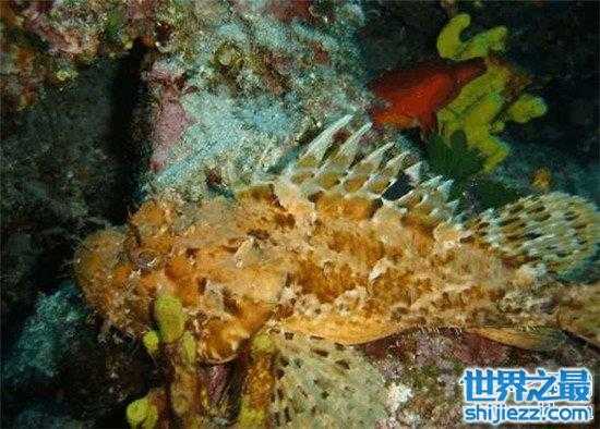 毒鲉,这是一种外形非常丑陋的一种鱼,它基本上涨得和石头仍为一体,甚至不仔细看都看不出来它。但是它却非常危险,身上有许多的刺,万一被它的次所扎到,就会让你疼痛万分。这时候你会感到剧痛,甚至无法呼吸,所以一定要小心。