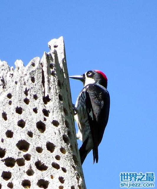 据说,一棵树上最多可以打出五万个孔洞。另外,除了树木,北美许多橡树啄木鸟还会将脑筋动到电线桿、住家梁柱上,让当地民众相当困扰。