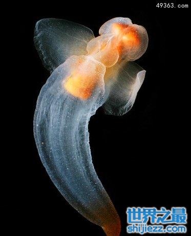 上图是2005年发现的管水母目动物。据科学家介绍,每个管水母目动物其实都是一个与水母相关的生物群落,如上图右半部分的游泳体,为整个群落提供推进力。这个群落中的成员分享同一个传递营养物的管状茎(橙色)。拉斯科夫在2009年12月介绍,有些管水母目动物体长达10英尺(约合3.1米),是深海中最大的动物之一。