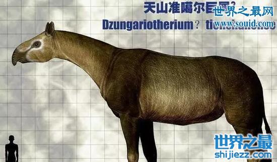 这货你以为是犀牛?你以为它一米多高?几吨重?NO NO NO !以巨犀中的 准噶尔巨犀属(Dzungariotherium)苇代表,这货体长4——6米,身高5米多,重约12——15吨,跟一条恐龙差不多。而且这货竟然是吃草的——当然,要是吃肉也长不了这么大,因为没有比它更大的食草动物了。这货头上无角,头、颈和四肢都很长,站起来肩部高可达5米,在中国生活过的巨犀种群长7——8米,体重15吨,为已知最大的陆生哺乳动物。CCTV5 人与自然《与古兽同行》有介绍过它。