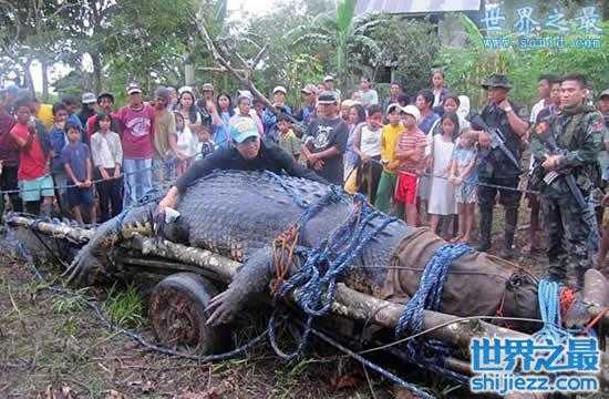 2011年9月,菲律宾捕获一条咸水鳄,这只被擒的鳄鱼体长6.4米,体重达到1075公斤。被《吉尼斯世界纪录大全》列为世界上最大鳄鱼。被取名为“洛龙”(Lolong)。四名男子用臂长估量它的长度……【查看详情】